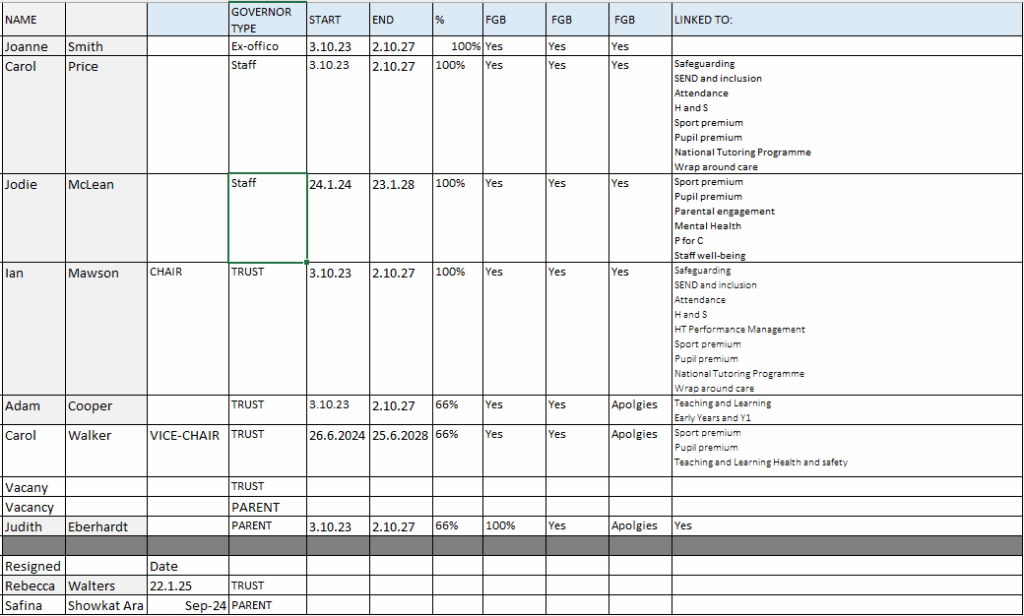 | Rebecca Walters | CO-OPTED | 1.9.21 | 31.8.25 | 71% | Yes | Yes | Apologies | Yes | Finance, EYFS, Pupil Premium, SEND & Inclusion, Teaching & Learning | ||